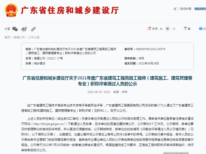 近日,2021年度广东省建筑工程高级工程师(建筑施工、建筑管理等专业)职称评审结果已出炉,我赢博yingbo(中国)陆仲勋、李学荣两位同事顺利通过高级工程师职称评审。
