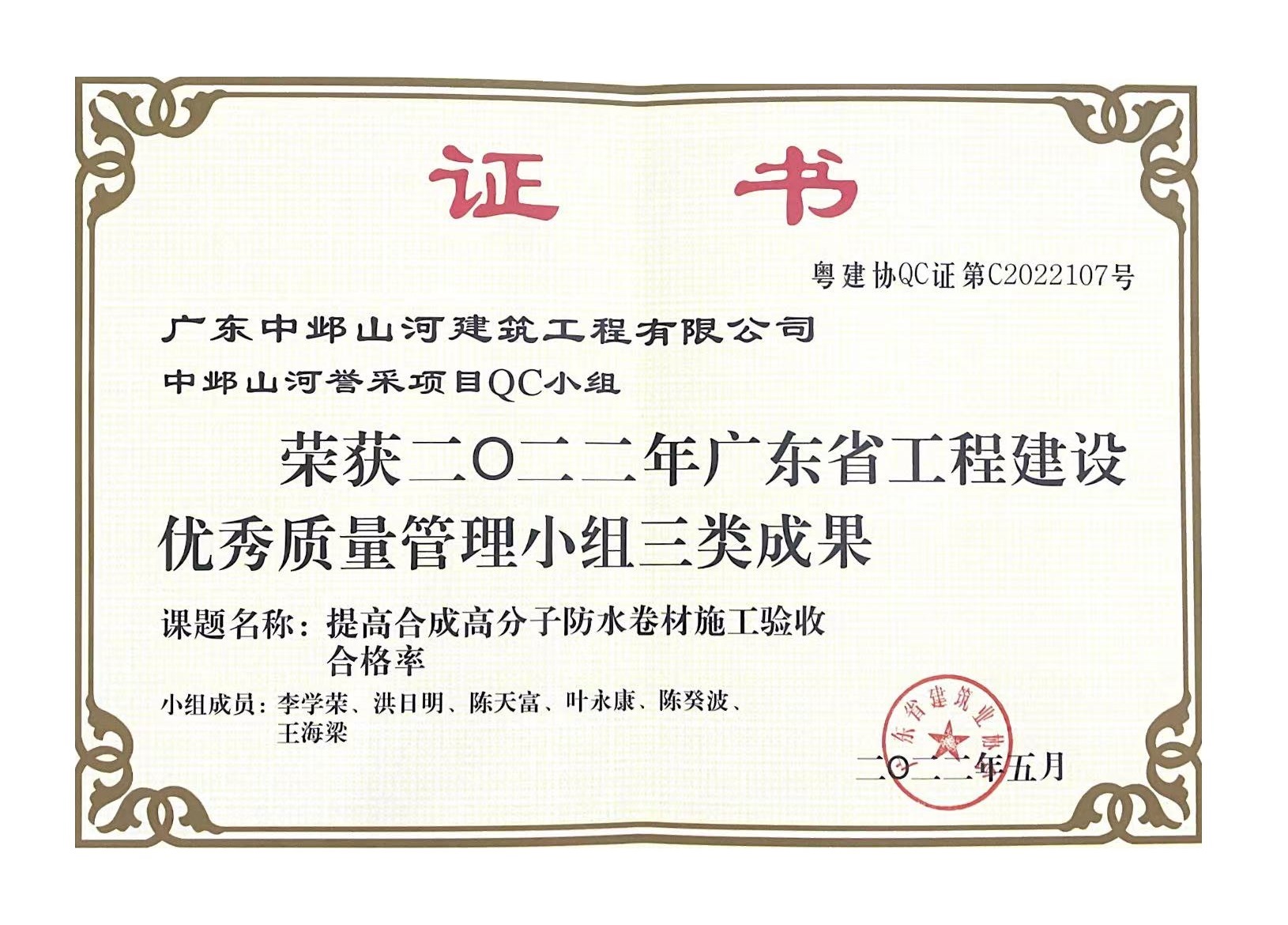 近日,广东省建筑业协会在官网上公布了2022年广东省工程建设优秀质量管理小组奖的审定通过名单,中寓建筑系统旗下广东中邺山河建筑工程有限赢博yingbo(中国)-中邺山河誉采项目QC小组申报的《提高合成高分子防水卷材施工验收合格率》的课题,获得优秀质量管理小组三类成果奖项。