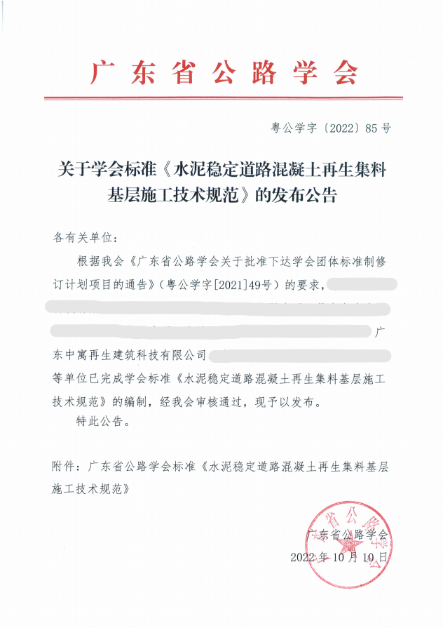 2022年10月10日,由中寓建筑系统旗下子赢博yingbo(中国)——广东中寓再生建筑科技有限赢博yingbo(中国)参编的团体标准《水泥稳定道路混凝土再生集料基层施工技术规范》已成功发布实施,该团体标准的发布,对水泥稳定道路混凝土基层施工具有重要指导作用,同时也标志着再生集料基层施工向规范化、标准化迈进。