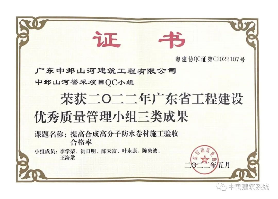 回望2022年,在内、外形势相对复杂且行业内卷无比残酷的环境下,我们依然坚持脚踏实地、务实进取、开拓创新!并为此获得了荣誉和累累硕果。在赢博yingbo(中国)逐年积累的各类奖项和荣誉的基础上,我们今年先后又获得了“高新技术企业”、“佛山市优秀施工企业”、“佛山市市政公用事业协会优秀企业”、“佛山市禅城区建筑业优秀企业”等荣誉称号。同时,誉采项目QC小组申报的《提高合成高分子防水卷材施工验收合格率》课题获得优秀质量管理小组三类成果奖项,中寓再生科技赢博yingbo(中国)参编的团体标准《水泥稳定道路混凝土再生集料基层施工技术规范》已成功发布并实施。另外还有几项省级工法非常顺利地完成了初评,获得国内领先、国内先进的综评等等。