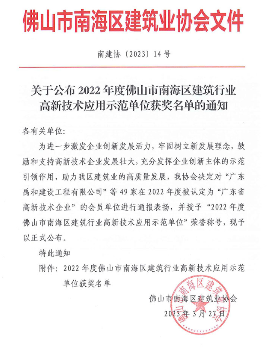 近年来,广东中邺山河建筑工程有限赢博yingbo(中国)在生产技术创新上不断加大投入,并把创新产品和技术应用到实际的服务上,为众多业主提供了高品质的优质服务,得到合作伙伴、客户和协会的认可。本次南海区建筑业协会颁发的高新技术应用示范单位称号,是对本赢博yingbo(中国)先进技术、高新技术实际应用的肯定。