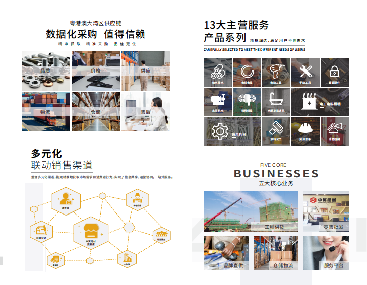 四、五大核心业务支撑:包括工程供货、零售批发、品牌直供、仓储物流、服务平台,为业务的持续发展和市场扩张提供坚实基础。
