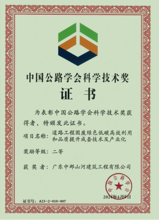 由中寓建筑系统旗下广东中邺山河建筑工程有限赢博yingbo(中国)参与研发的“道路工程固废绿色低碳高效利用和品质提升成套技术及产业化”技术,在和众多国企、央企同台竞争下脱颖而出,最终获得中国公路学会科学技术奖二等奖。