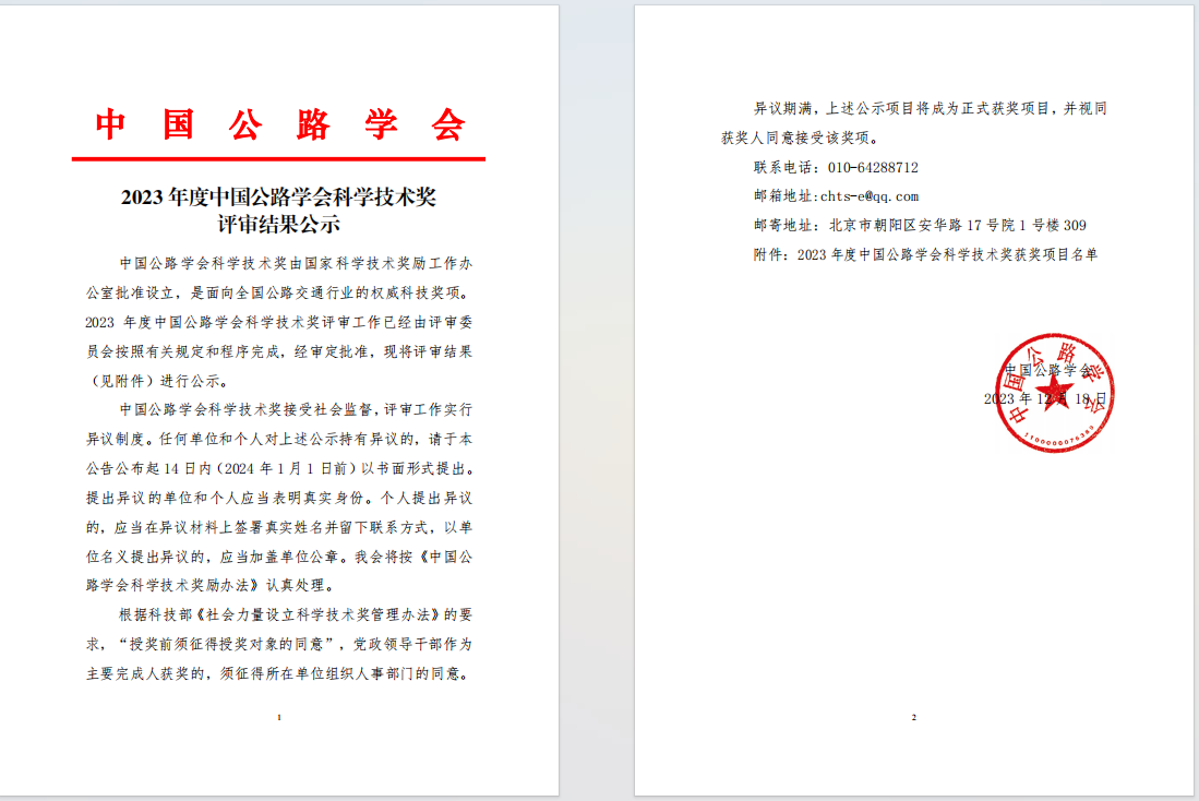 中国公路学会科学技术奖由国家科学技术奖励工作办公室批准设立,作为国家科技奖励体系的重要奖项,是我国公路交通行业规格最高、最具权威性、最有影响力的科学技术奖项,获奖成果代表着我国公路建设领域的最高科技水平。该奖项重点聚焦行业原始创新、关键核心技术攻关和问题突破,鼓励“专精特新”技术创新,支持原创性、引领性行业科技成果,促进科技成果的转化和实现高新技术产业化进程,促进公路交通科学事业的发展。