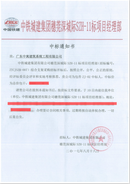 按照公平、公正、公开原则,经评标委员会评审和实地考察推荐,我司成功中标 “中铁城建集团有限赢博yingbo(中国)穗莞深城际SZH-11标综合支架采购招标项目(招标编号:ZTCJSZH-007),包件ZJ-01(图一)、ZJ-02(图二)业务”。