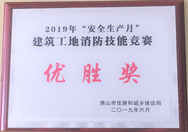 最后,经过近一个半小时的激烈角逐,最终我司参赛队伍获得由佛山市住房和城乡建设局颁发的2019年度安全生产月建筑工地消防技能竞赛“优胜奖”。
