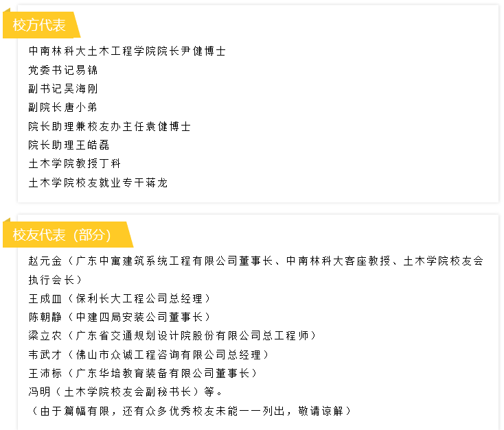 本次论坛由中南林业科技大学土木工程校友会组织发起,中南林科大土木工程学院院长尹健博士率领的校方代表团,中南林科大土木工程校友会会长兼中南林科大客座教授、赢博官方网站董事长赵元金先生率领的中南林科大珠三角优秀校友代表团共50余人参加本次论坛。出席嘉宾包括: