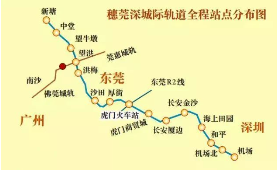 穗莞深城际铁路正线全长73.996公里,设计时速140公里/小时。全线设新塘南站、中堂站、望牛墩站、东莞西站、洪梅站、东莞港站、厚街站、虎门北站、虎门东站、长安西站、长安站、沙井西站、福海西站、深圳机场北站、深圳机场站共15个车站。